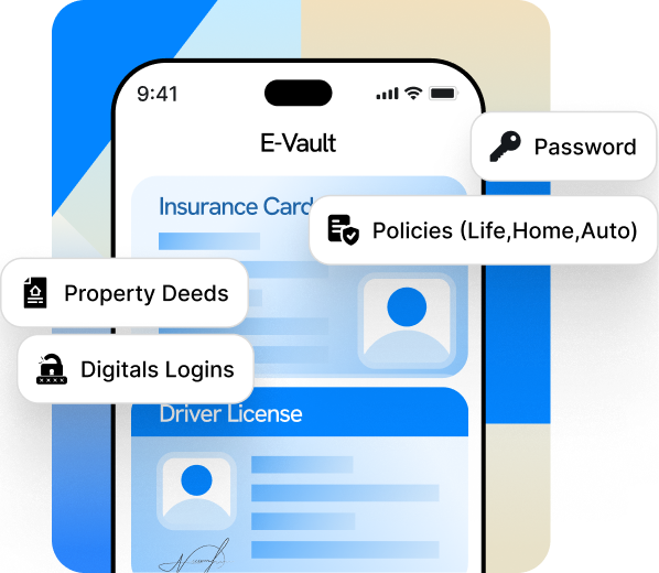 Give your family one organized place for the critical details—protected with end-to-end encryption (E2EE). You decide who sees what, and when. What you can keep (examples):